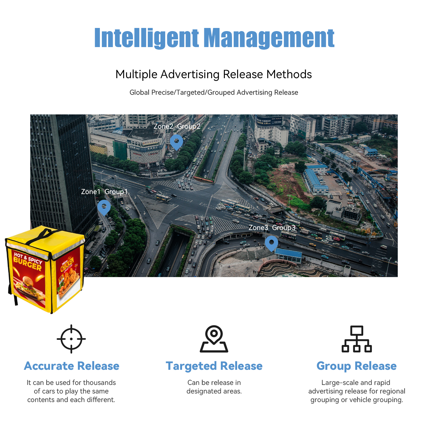 GPS fixed-point playback: Change ADs by location,such as show KFC video when taxi led sign arrive KFC shop.