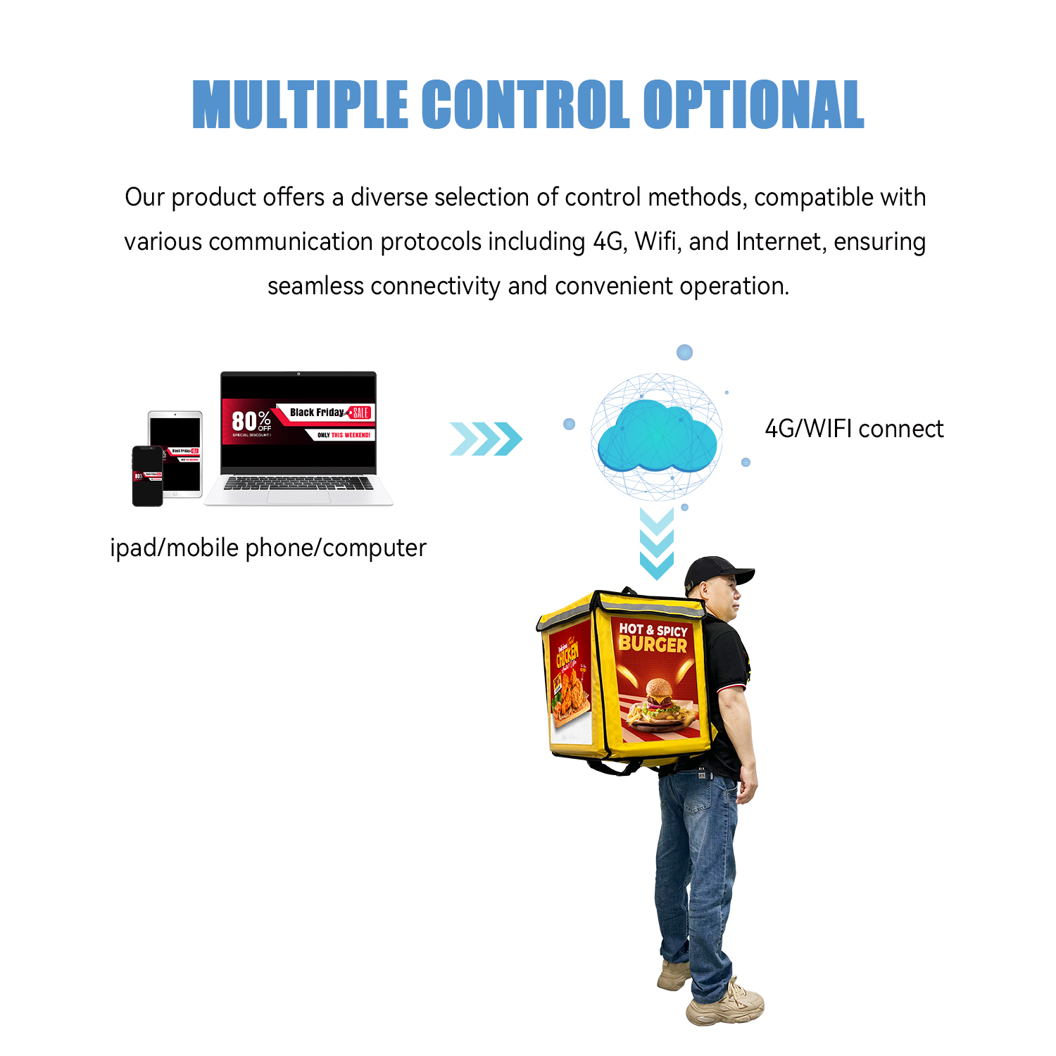 Multi-control method:USB/RJ45/Wifi/4G are optional.
